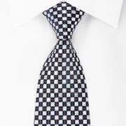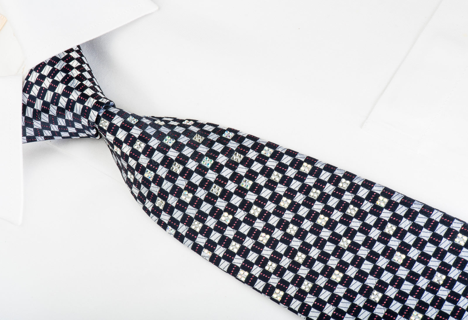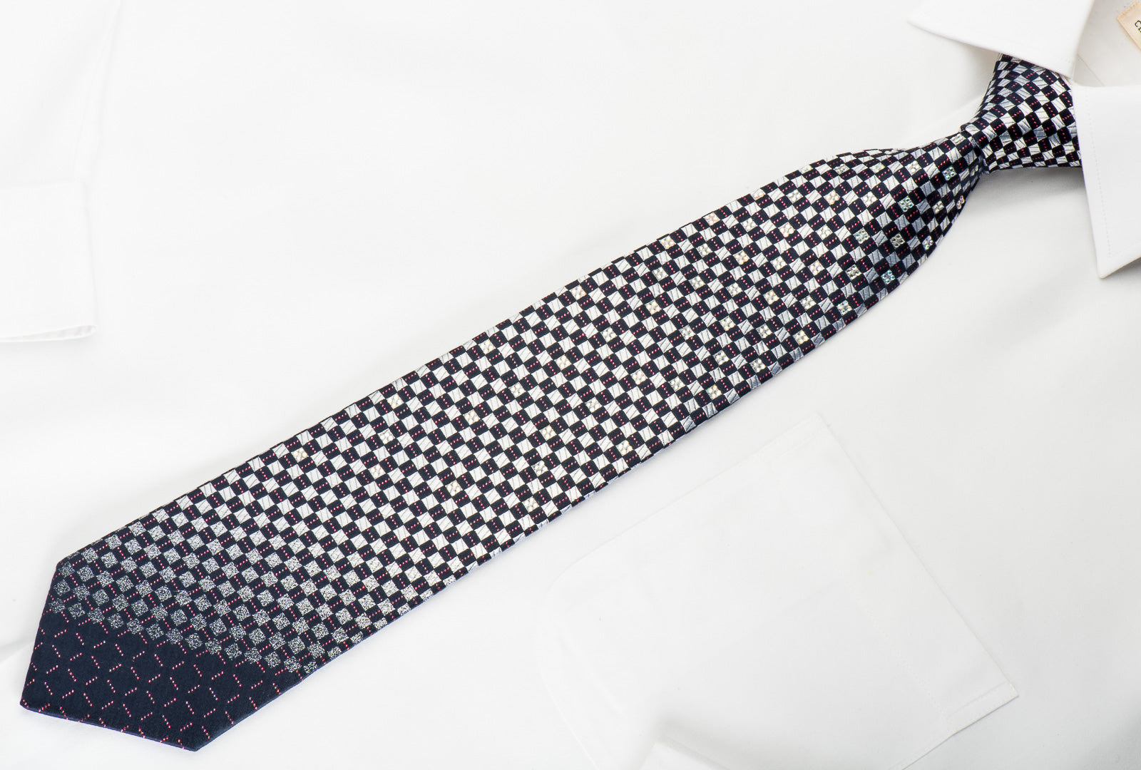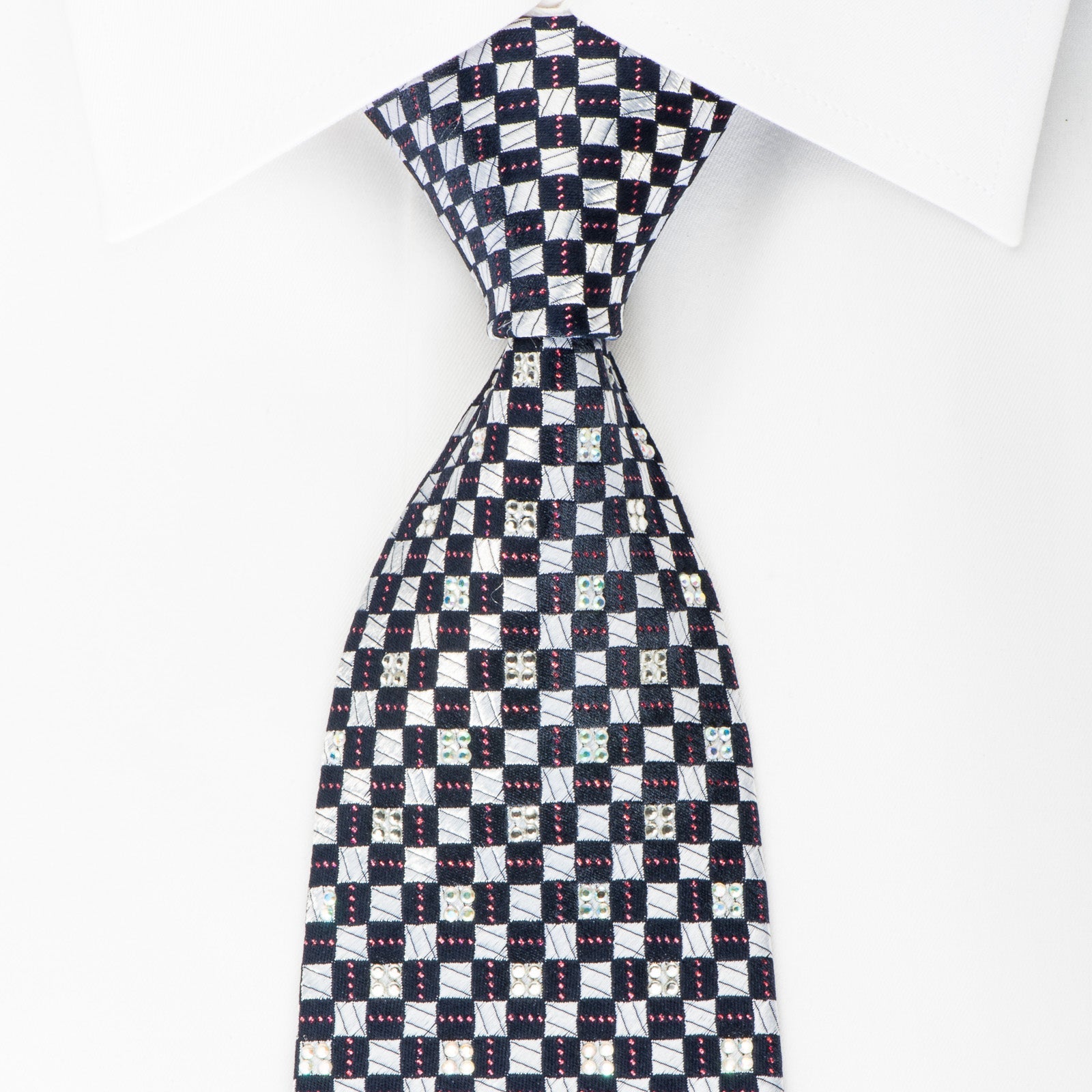 Esta é uma elegante gravata de seda de Strass perfeita para todas as ocasiões feita à mão e projetada pela marca renoma. Apresentando um elegante design de prata verificado em seda da Marinha, brilhando com strass e brilhos vermelhos.