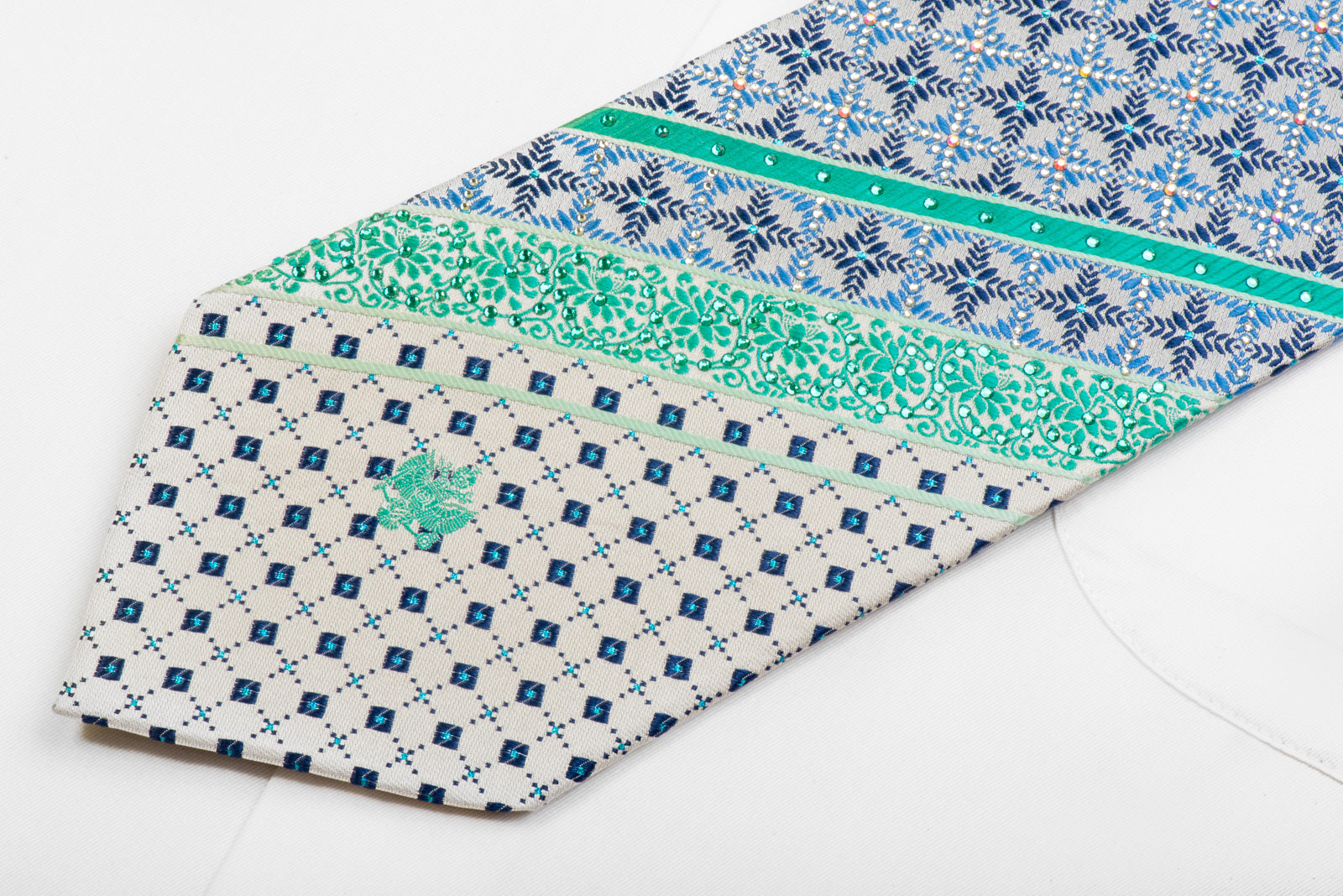 Material - Seda Design - Listrado Cor - Azul, Turquesa Comprimento - Clássico (57 pol.-60 pol.)(145 cm-153 cm) Largura - Clássico (3 1/4 pol.-3 3/4 pol.)(8 cm-9,5 cm) Recursos especiais - Strass AB, brilhos azuis, strass de cristal, strass turquesa Fornecedor - San-Dee