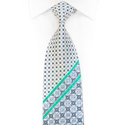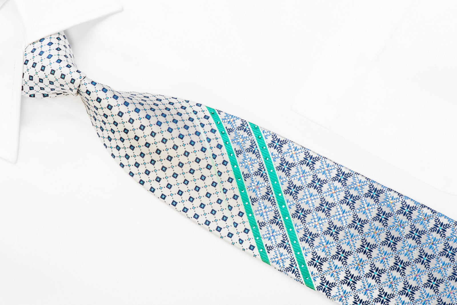 Gravata de seda de strass elegante perfeita para todas as ocasiões feita à mão e projetada pela marca renoma. Apresentando um elegante design turquesa tecida, listrado azul e cartouche em prata, brilhando com branco claro, strass de cristal turquesa e embelezado com brilhos azuis metálicos.