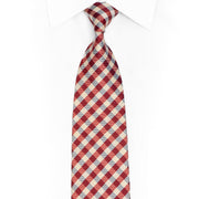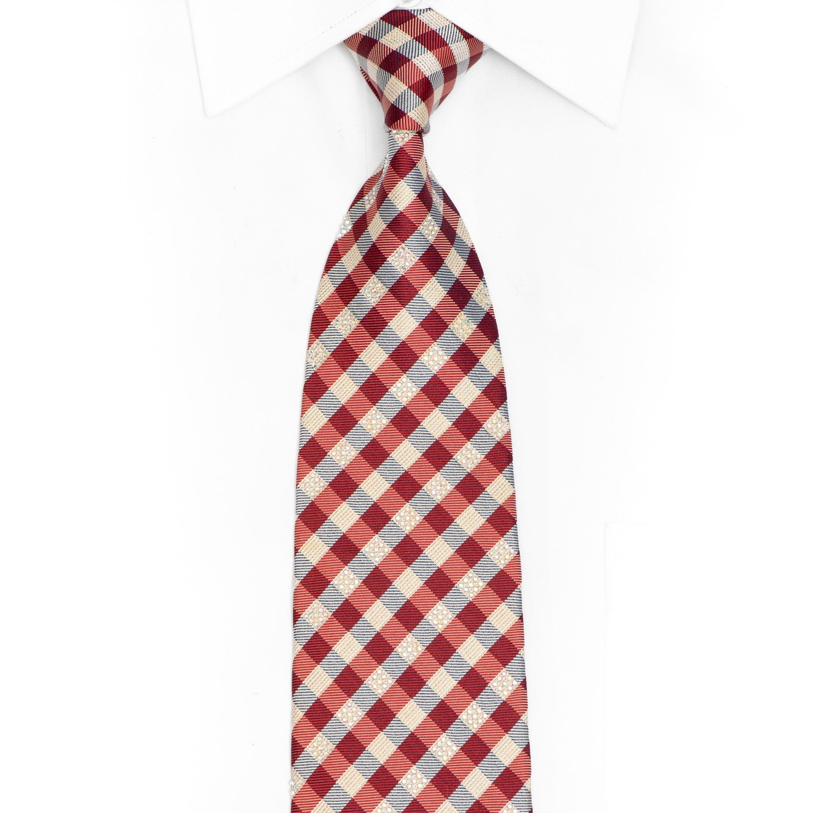 Elevate your formal wardrobe with this distinctive gingham silk necktie featuring subtle rhinestone embellishments. The classic red and cream check pattern is enhanced with delicate crystal accents that add a touch of refined sparkle without overwhelming the traditional aesthetic.