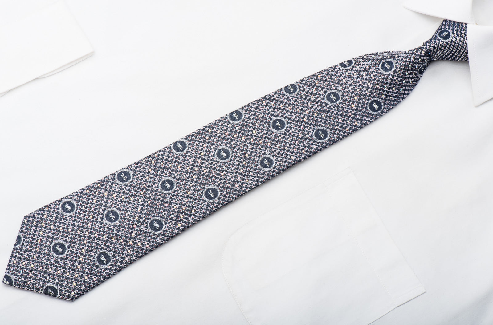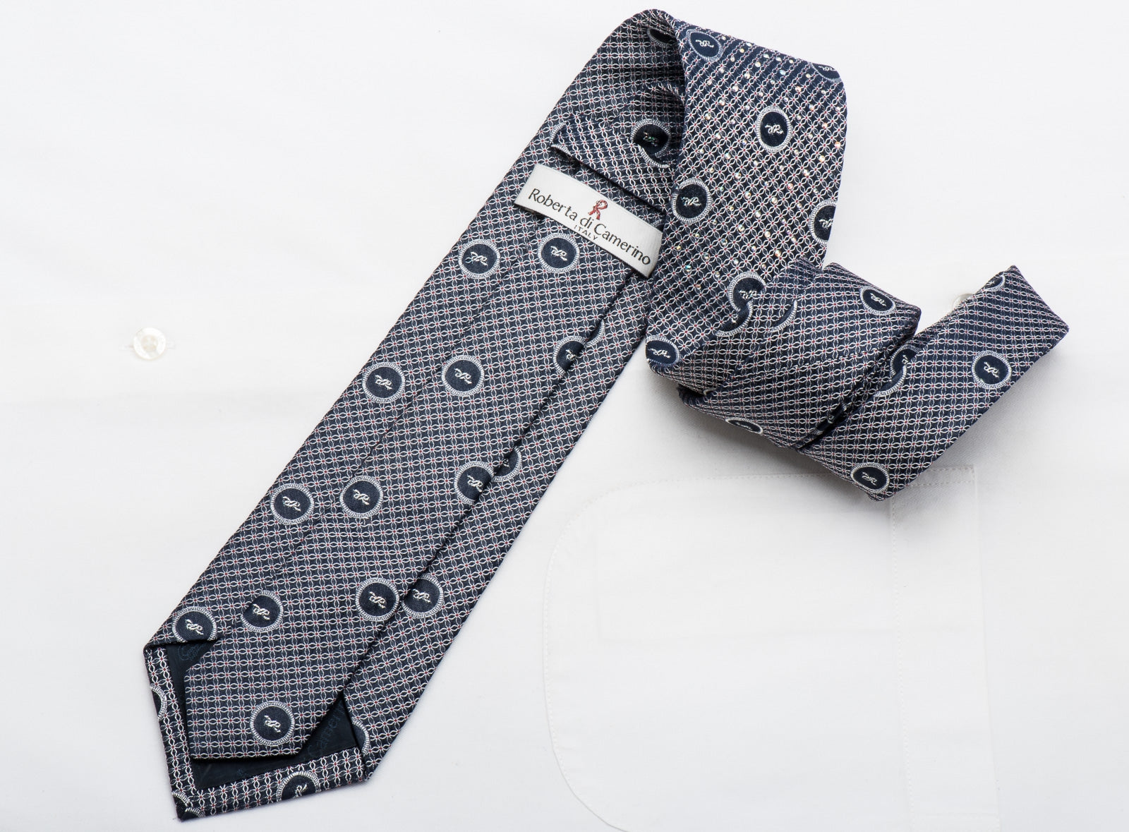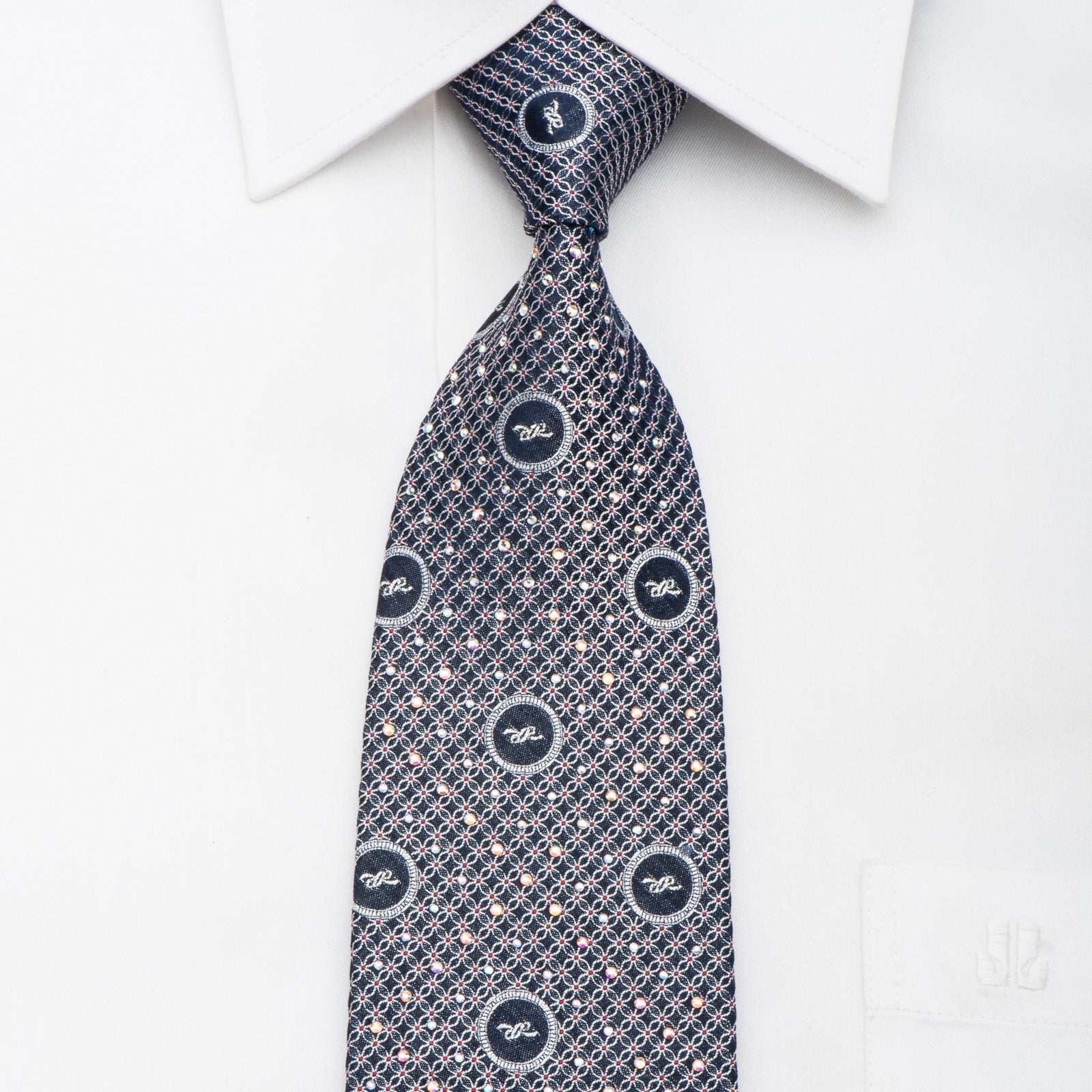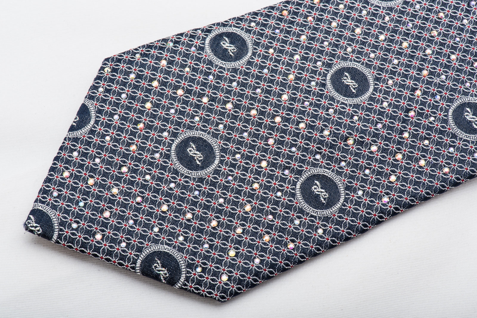 Gravata de seda de strass estilosa perfeita em todas as ocasiões feita à mão e projetada pela marca roberta di Camerino. Apresentando um elegante design Trellis prateado em azul marinho, coberto com rhinestones de cristal AB brilhantes.