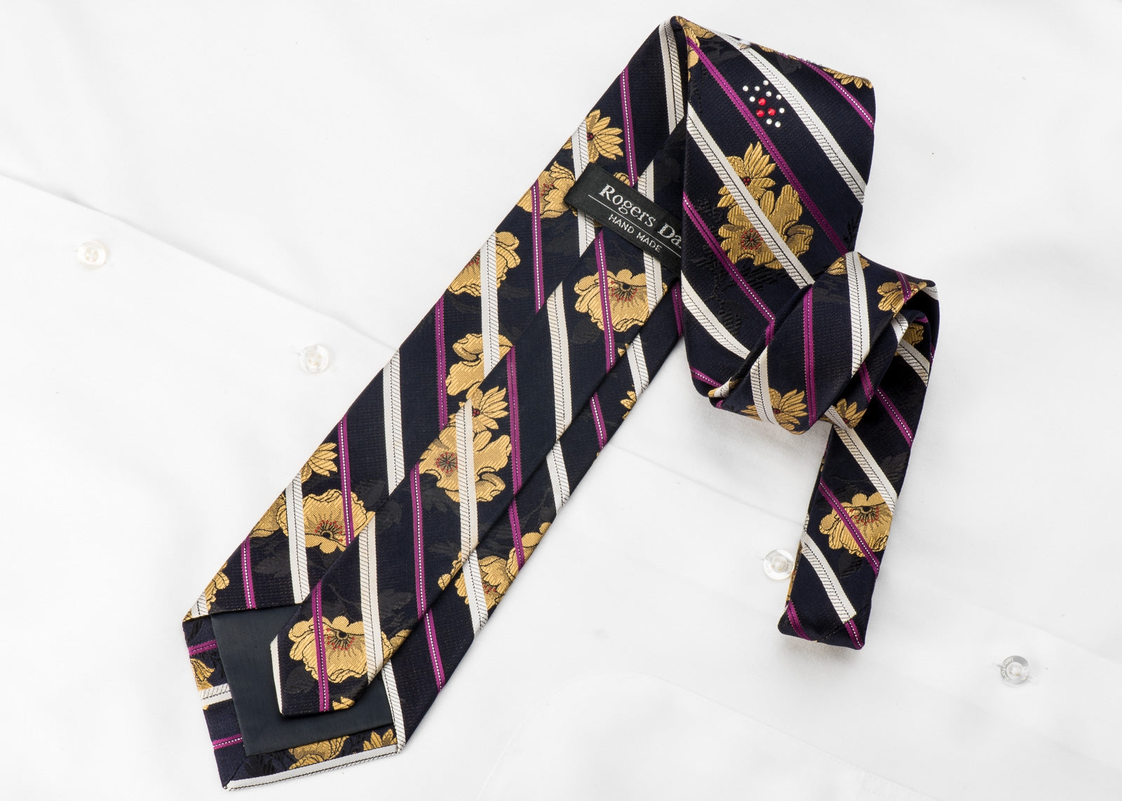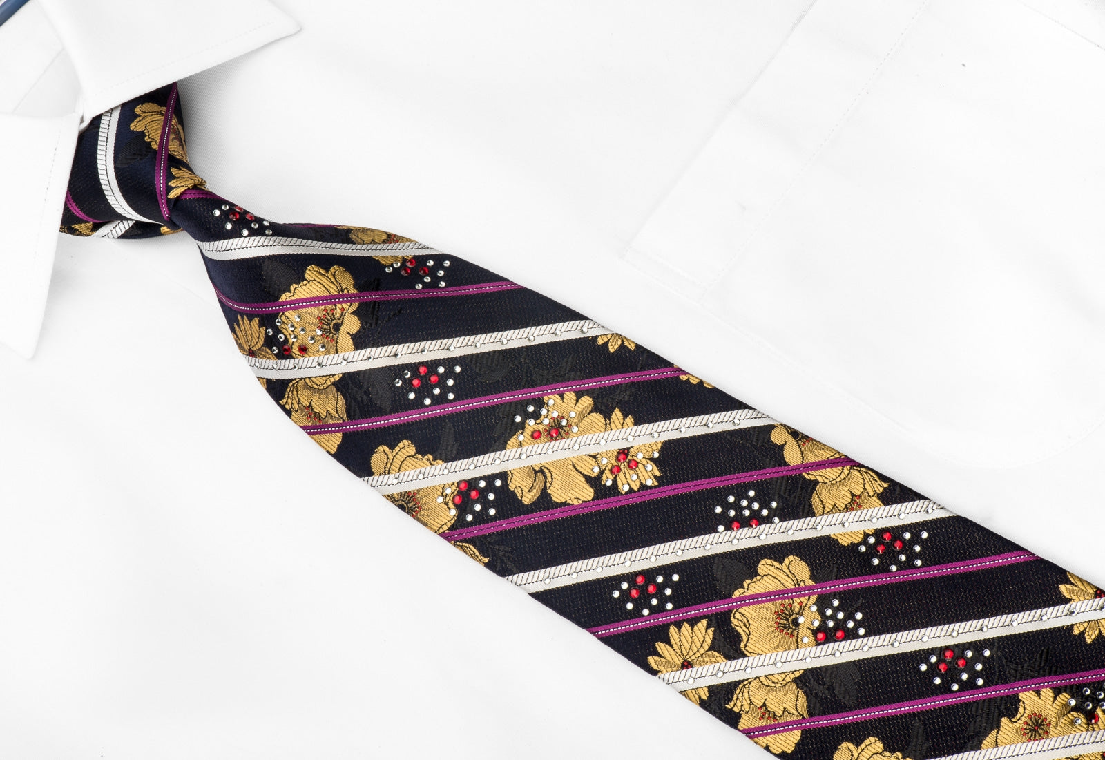 Gravata de cristal masculina elegante perfeita em todas as ocasiões feita à mão e projetada pela marca rogers dail. Apresentando um elegante floral amarelo, rosa prateado Design listrado em seda azul marinho tecido, embelezado com vermelho, strass de cristal branco e brilhos prateados.