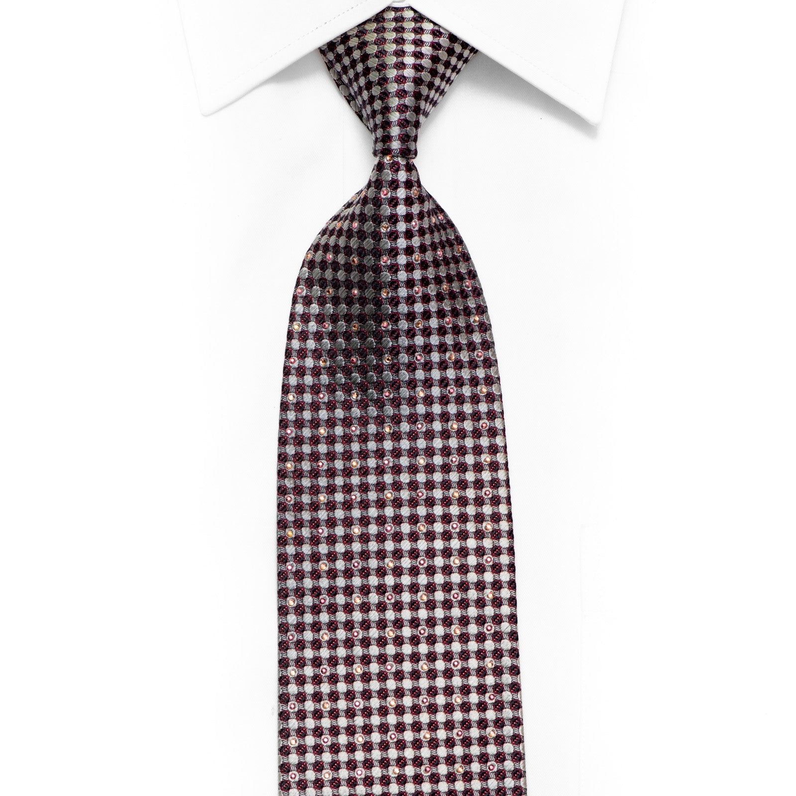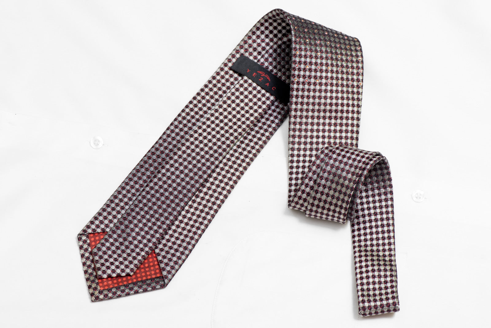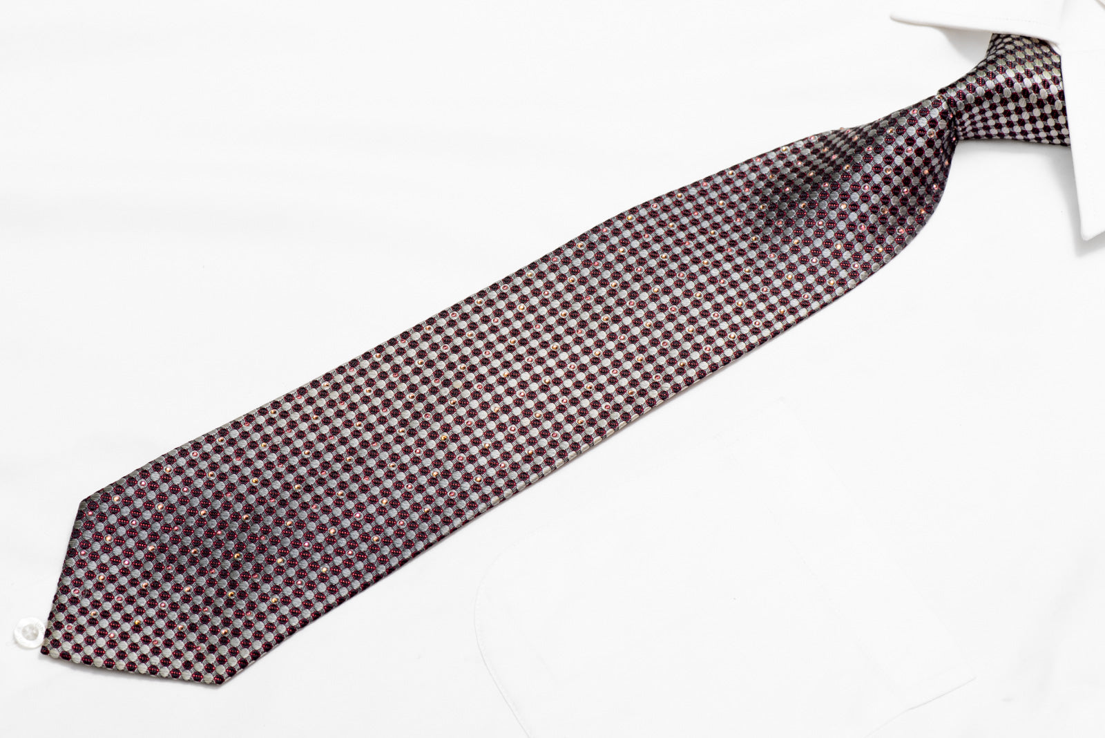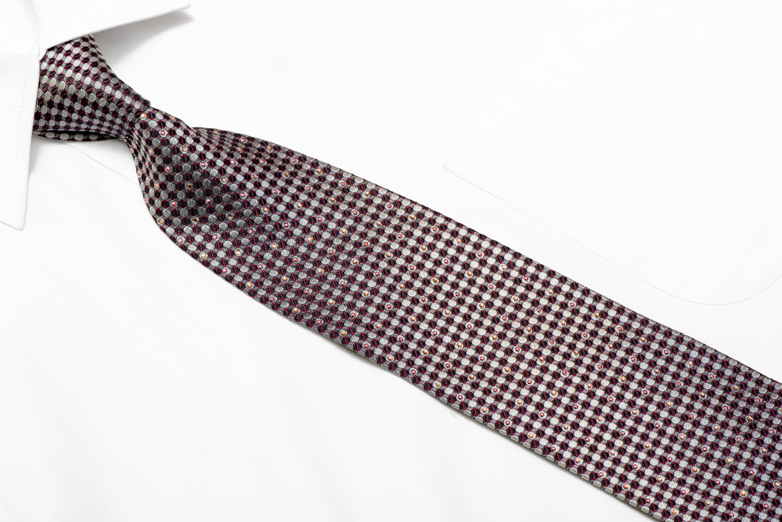 Material - Seda Design - Geométrico Cor - Prata, Marinha Comprimento - Clássico (57 pol.-60 pol.)(145 cm-153 cm) Largura - Clássico (3 1/4 pol.-3 3/4 pol.)(8 cm-9,5 cm) Recursos especiais - Strass, brilhos vermelhos, strass roxos Fornecedor - Yezak