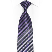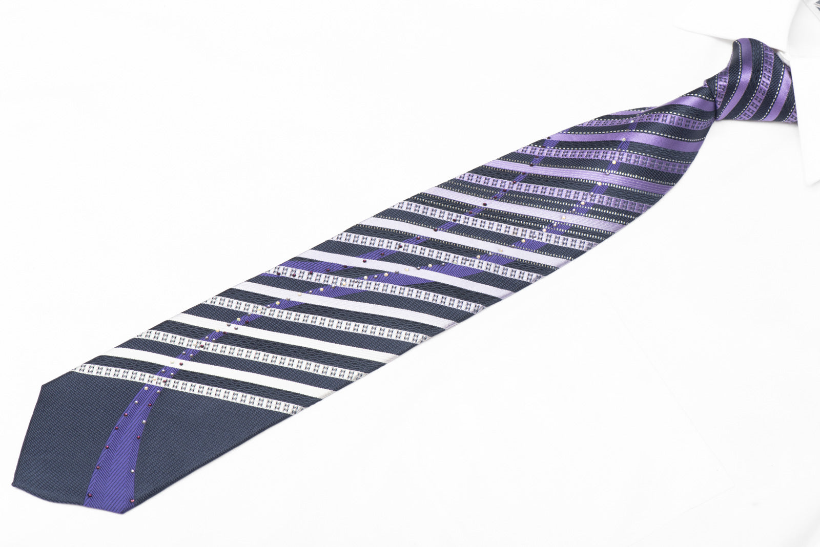 Deixe-nos apresentar-lhe a nossa gravata de seda com strass listrado roxo prateado em azul marinho com brilhos - perfeita para adicionar brilho ao seu guarda-roupa.