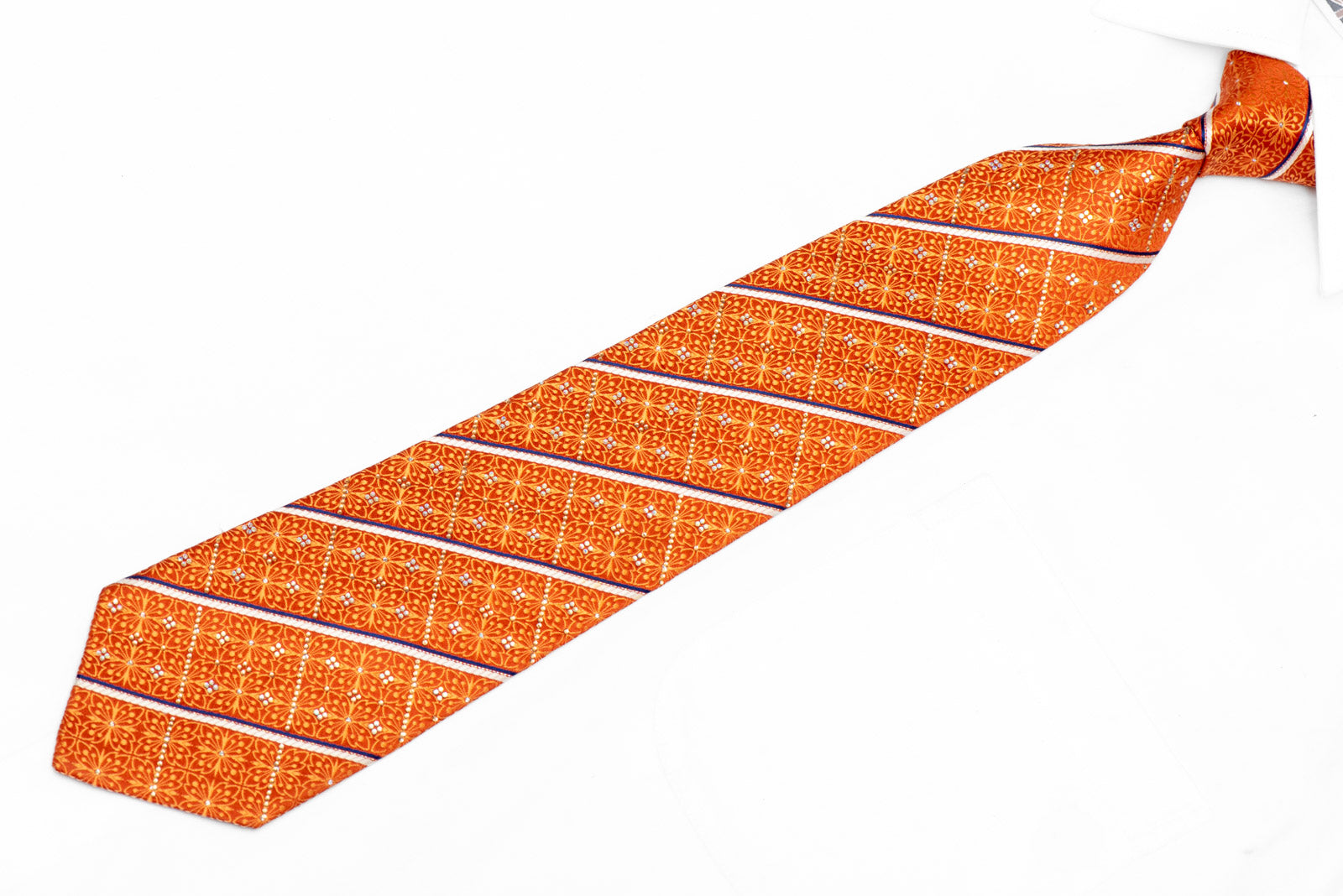The Silver Striped On Orange Cartouche Rhinestone Silk Tie With Sparkles is the perfect accessory for any formal event. Its elegant design and added sparkles will surely make you stand out in a crowd. Don't miss out on this opportunity to elevate your style and impress everyone around you.